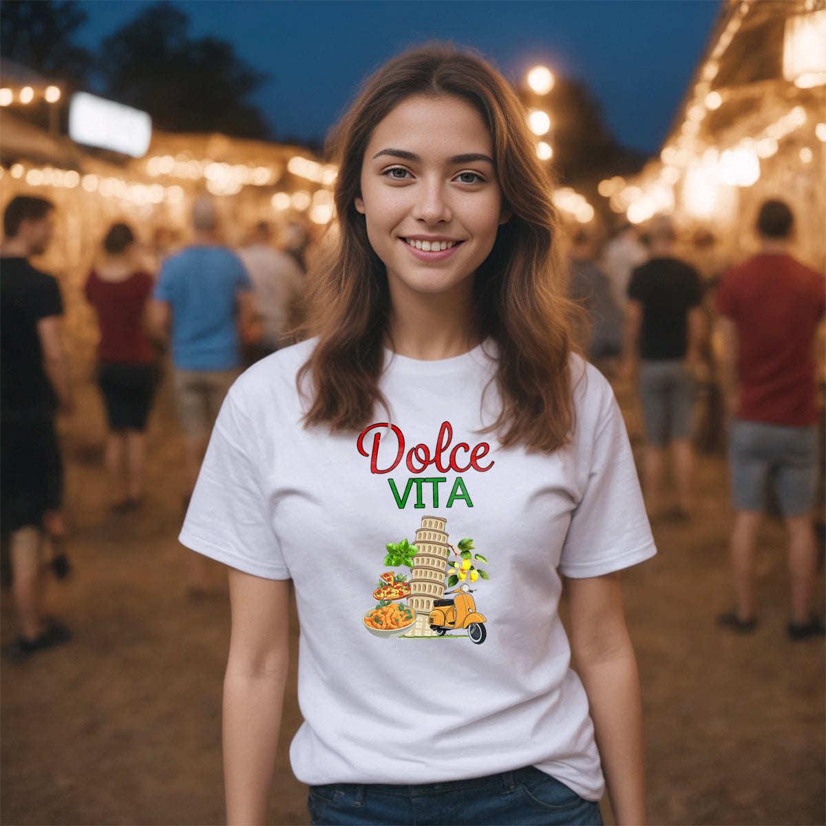 Turn heads with this playful homage to Italy’s most beloved (and maybe a few overrated) symbols. Featuring a bold design of a Scooter, the Leaning Tower of Pisa, pizza, pasta, and lemons, this shirt is perfect for those who love Italian culture—but with a twist of irony.